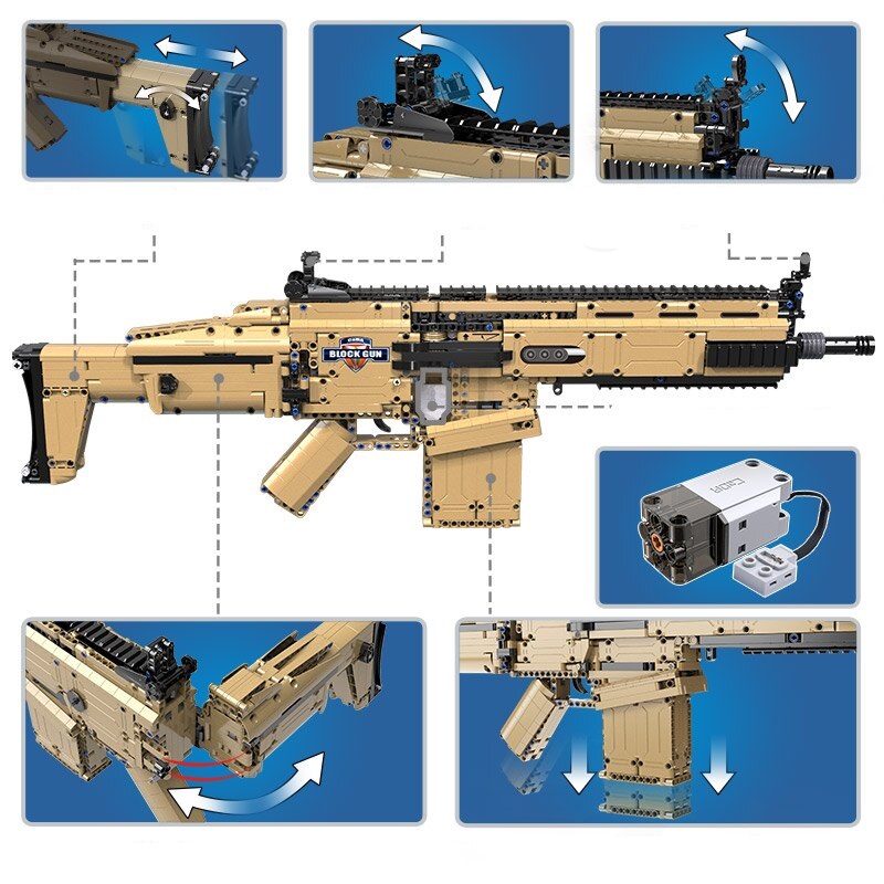 Создатели конструктора C81021 CADA Штурмовая винтовка FN SCAR 17S оборудовали аналог автоматикой. Благодаря включенному в состав игрового комплекта электромотору и блоку для батарей из оружия можно стрелять очередями из пластмассовых пулек.