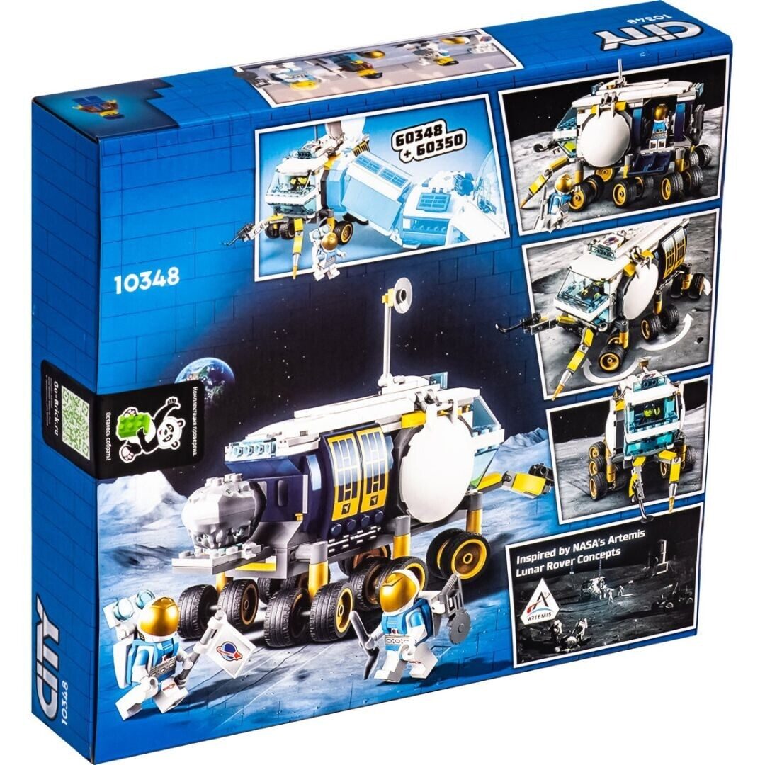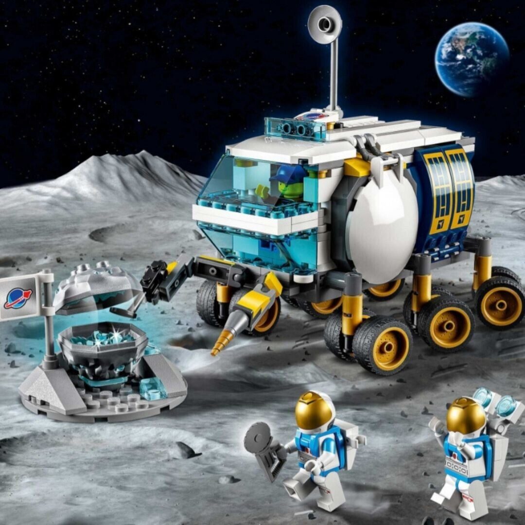 - 3 минифигурки пилот-оператор лунохода в кепке, женщина-астронавт в скафандре с дисковой пилой, космонавт в скафандре с прожекторами;