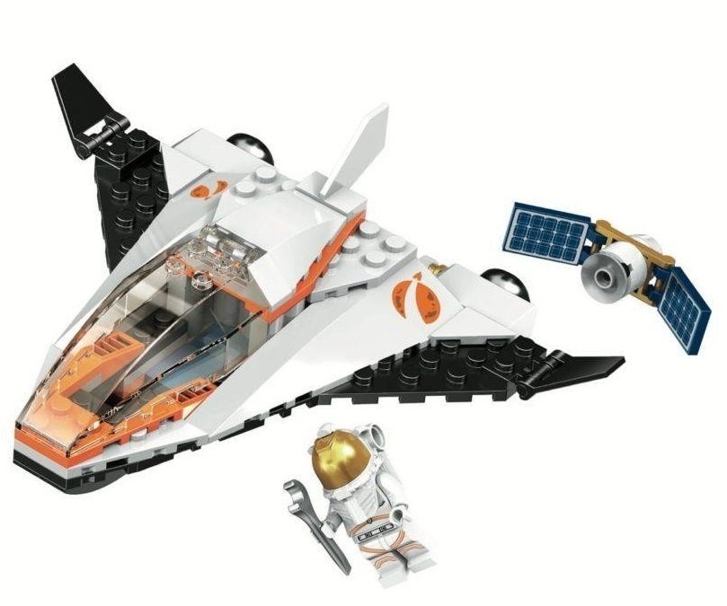 В передней части летательного аппарата в конструкторе Миссия по ремонту спутника располагается кабина управления. За ней размещается грузовой отсек с нишей для транспортировки космического аппарата. По бокам от него в наборе Сити Миссия по ремонту спутника располагаются «двухслойные» крылья. Верхний белый слой сливается с корпусом космического судна. Нижний черный слой обеспечивает дополнительную маневренность, плавность полета космолета. Преимуществом сборного объекта является его способность объединяться с другими наборами и ложиться в основу сборки нового уникального космического аппарата.